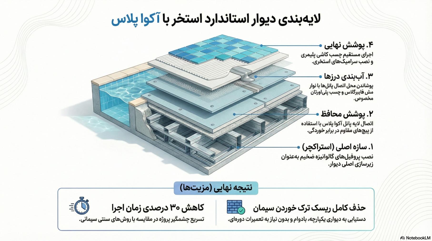 ۳. حذف مرحله سیمانکاری و سرعت اجرا: در روش سنتی ساخت استخر، نیاز به اجرای لایههای ضخیم سیمان و توری مرغی برای زیرسازی کاشی بود که زمانبر و سنگین است. با استفاده از پنلهای آکوا پلاس، شما یک سطح کاملاً صاف و تراز دارید که مستقیماً آماده نصب سرامیک و کاشی است. این ویژگی سرعت پیشرفت پروژه را چندین برابر میکند و وزن مرده سازه استخر را کاهش میدهد.